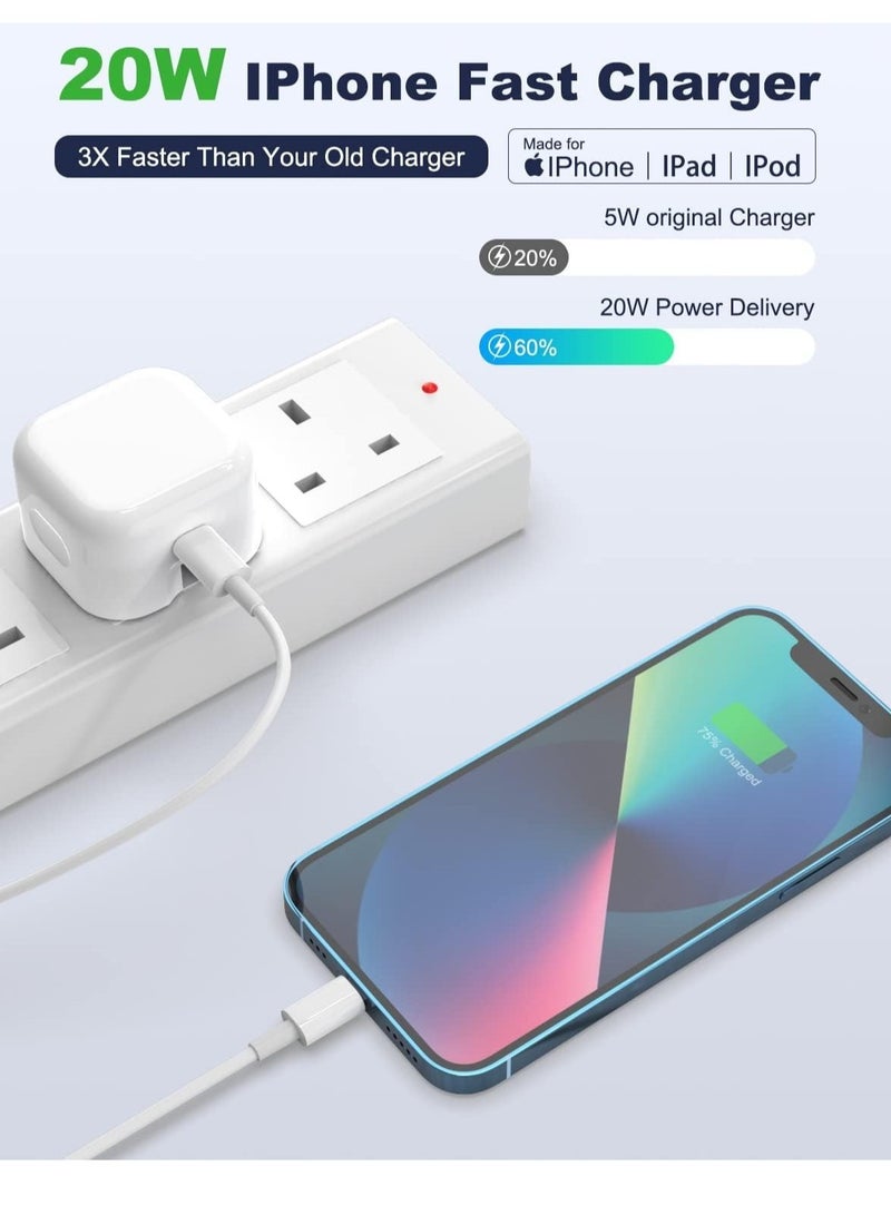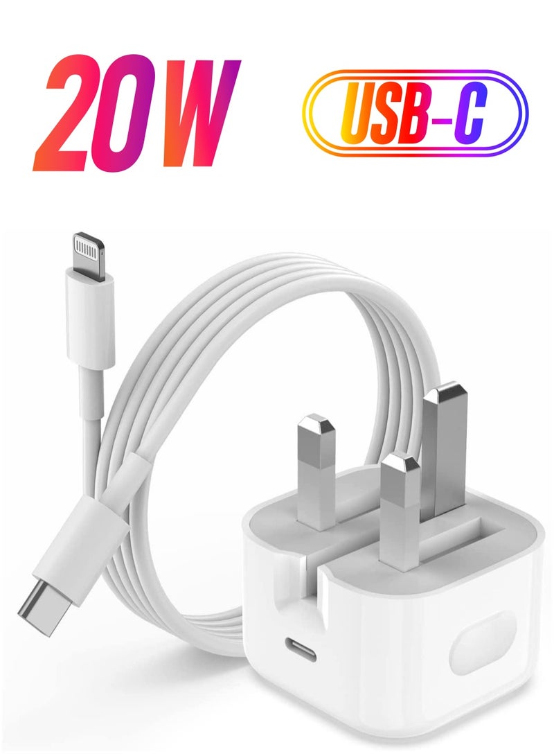Charge your Apple devices quickly and safely with this 20W USB-C Fast Charger, specially designed for the latest iPhone and iPad models. Equipped with advanced Power Delivery (PD) technology, this fast charger can power up your iPhone 14 or similar models up to 50% in just 30 minutes, saving you time and keeping your devices ready for use. The included 5FT USB-C to Lightning cable is perfectly compatible with a wide range of Apple products, ensuring a reliable and efficient connection. Whether you’re charging your iPhone 14 Pro Max, iPad Pro, or any other Type C compatible device, this charger delivers optimal power for fast and efficient charging. Designed with portability in mind, the compact UK plug design makes it easy to carry this charger wherever you go, perfect for home, office, or travel. The lightweight construction ensures that it won’t add bulk to your bag, while the sleek white finish blends seamlessly with your Apple devices. This charger is not just fast, but also safe. With built-in protections against overcharging, overheating, and short-circuiting, you can trust that your devices are in good hands. Upgrade your charging experience with this powerful and versatile 20W USB-C Fast Charger, ensuring your devices are always charged and ready for action.