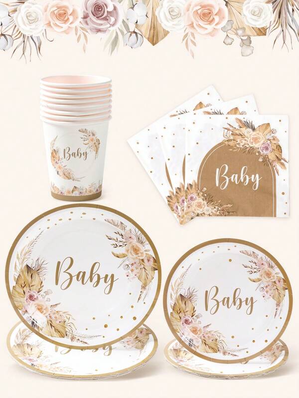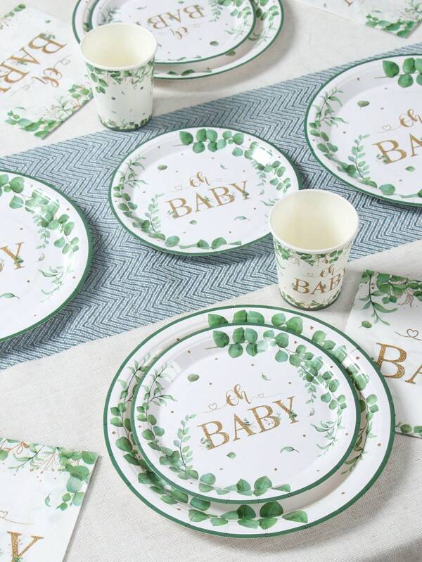 40pcs/Set Oh Ba By Theme Disposable Tableware Set, Eucalyptus Leaves Style Paper Cutlery, For Birthday Decor, Babe Shower Decor Gender Reveal Decor Kitchen Decor, Birthday Gifts, Party Decor, Including 8pcs 7inch & 9inch Paper Plates Food Container, Kitchen Food Tray Cake Tray & 16pcs Napkins & 8pcs Cups, Party Favor, Party Tableware Set Supplies |