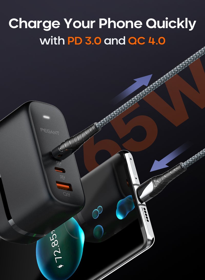 GaN / PD / QC / PPS Technologies: The 65W Charger is running on GaN (Gallium nitride) chip, making the fast charger smaller, cooler in use, more efficient with power and very quick with charging in comparison to the conventional analogues. Power Delivery 3.0 (PD3.0), Quick Charge 3.0 (QC3.0) and Programmable Power Supply (PPS) enhance charging efficiency through the roof.