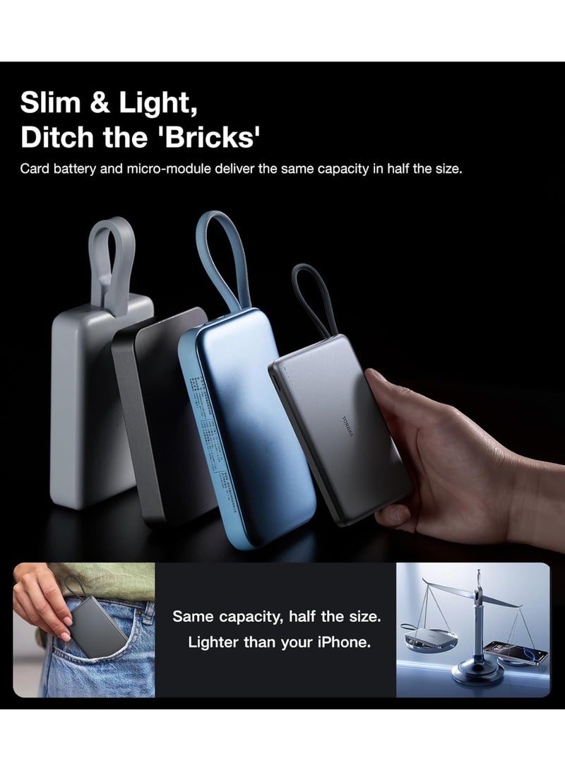 The portable charger with built-in cables serves dual purposes as both a charging cable and a carrying strap, supporting fast charging for all Type-C devices. Crafted from durable rock-climbing rope material, it protects the internal wiring. The integrated 7.09-inch USB-C cable offers convenience and can withstand over 20,000 bends, making it both durable and user-friendly.