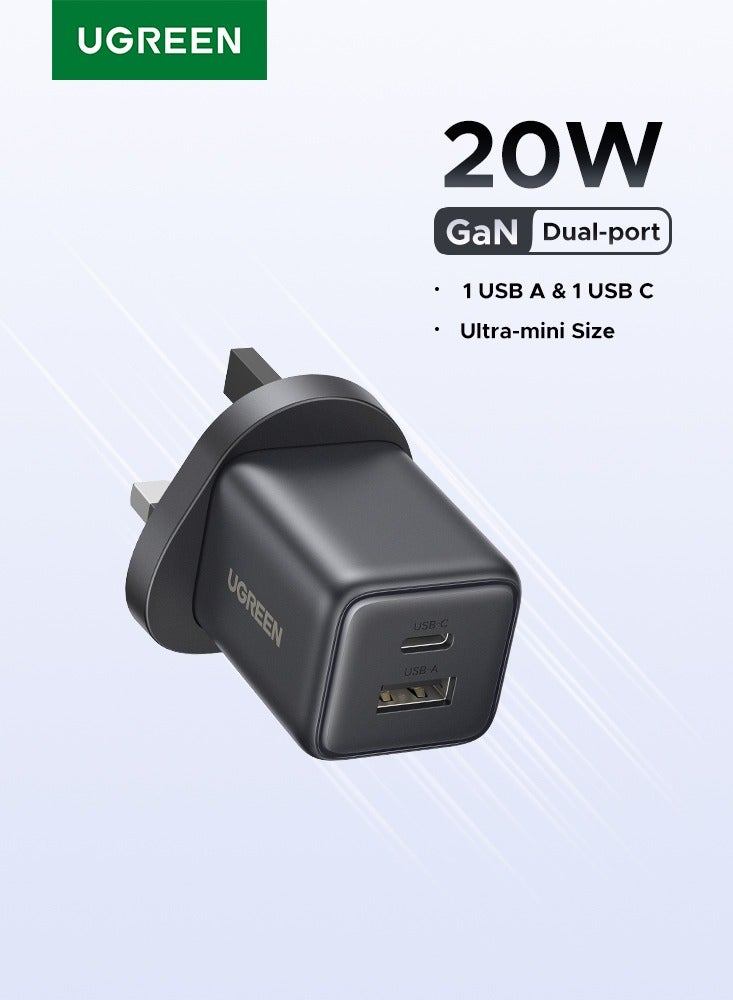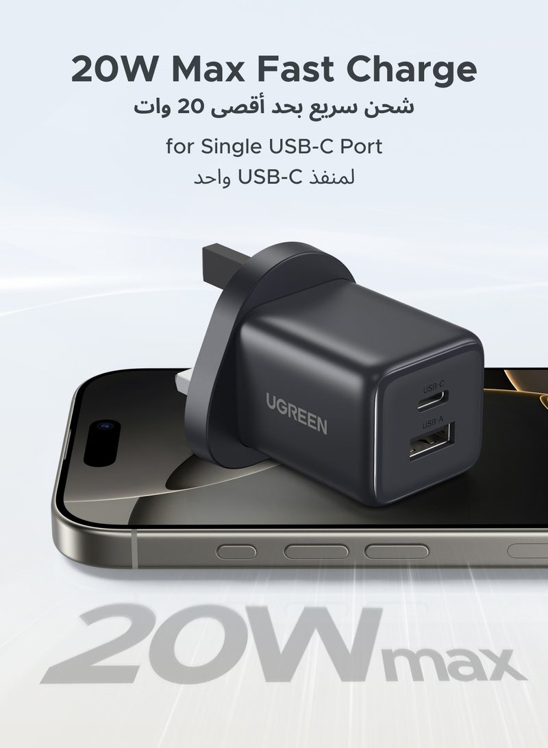 Ugreen 20W Charger USB Type C GaN Dual Ports 1C1A Fast Charging iPhone Charger Adapter Safe Charging And Portable Size Compatible With iPhone 16, 15 Series Tablet, Apple Watch, AirPods, DJI Pocket, Samsung – Black